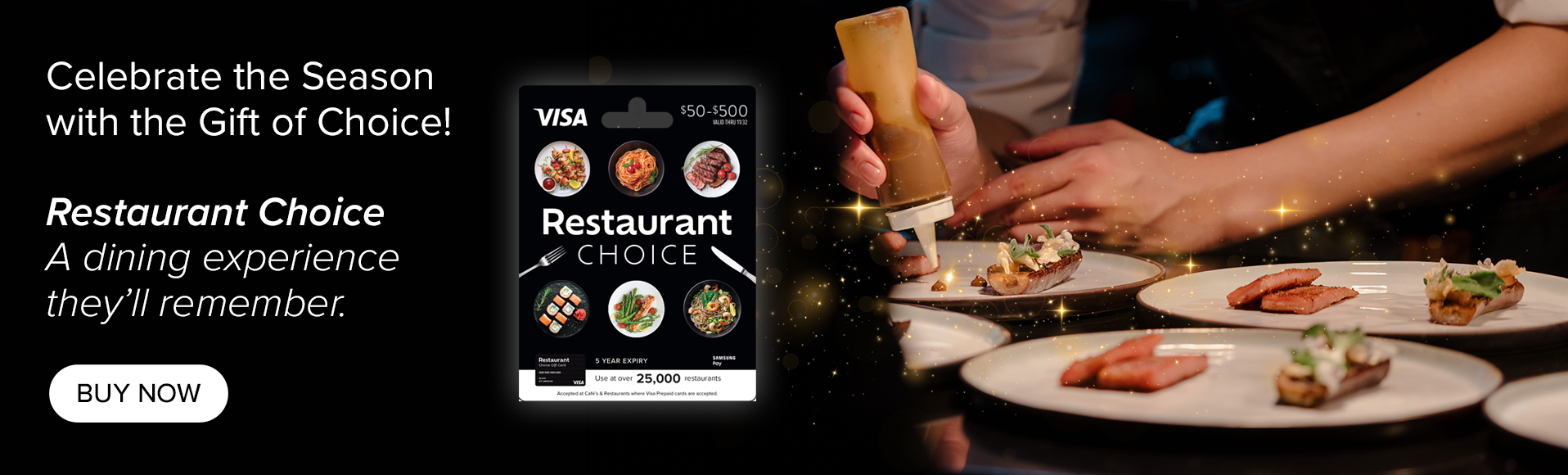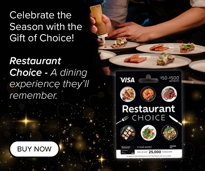 Use the Restaurant Choice Gift Card to dine at your favourite restaurant without leaving your home